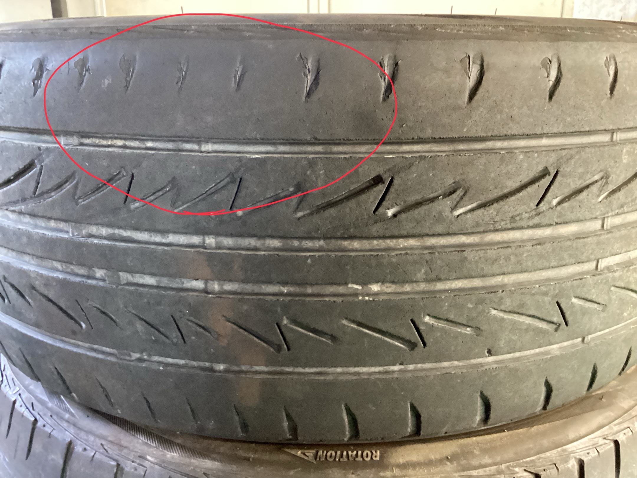こちらの画像は同じタイヤの画像なのですが赤い丸のところ見ていただくと極端に溝が少ないことがわかります!