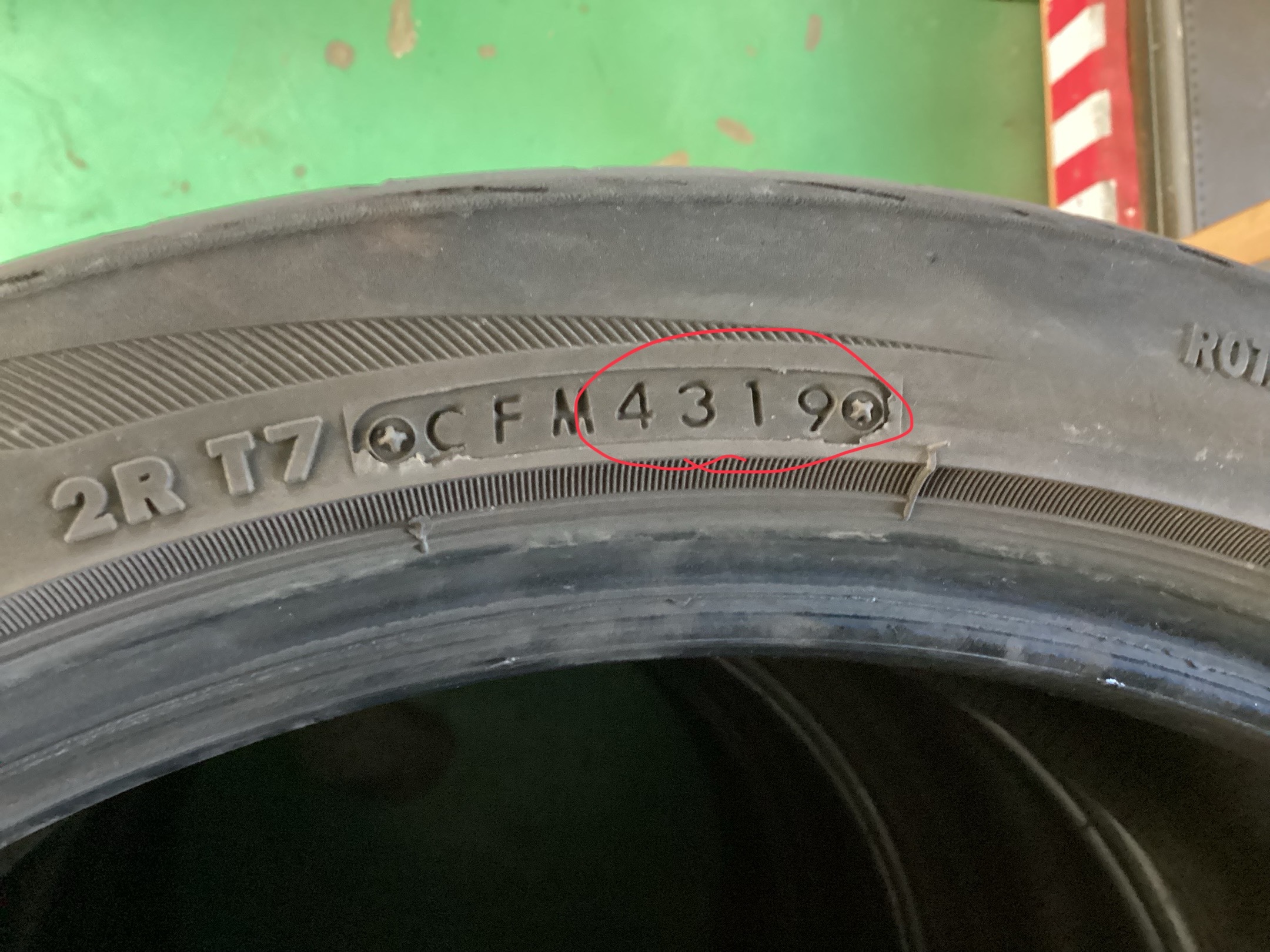 赤い丸で囲われていれる数字はタイヤの製造日が刻印されていて前の二桁が週、後ろの二桁が西暦になります!