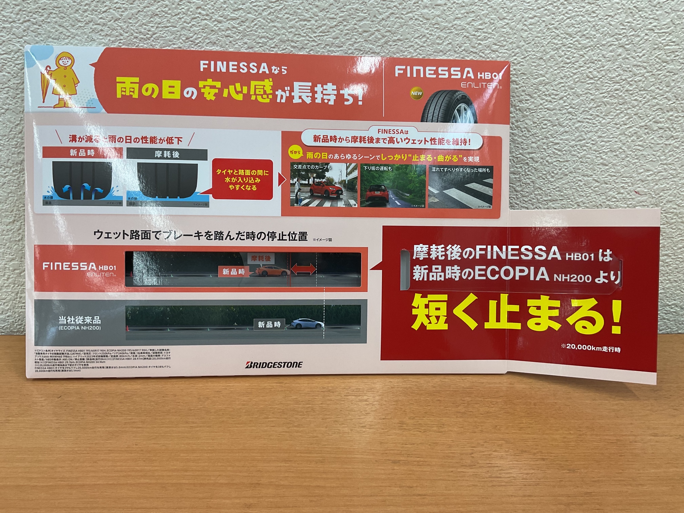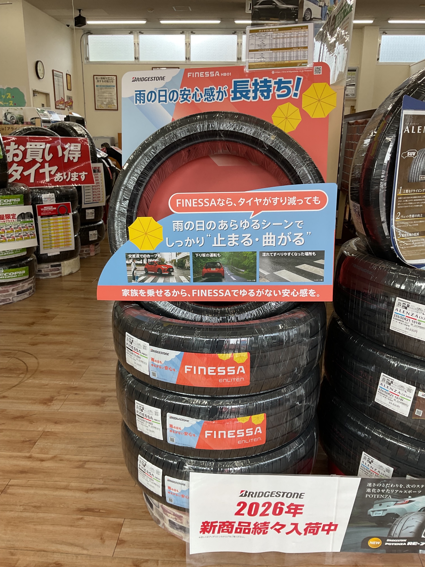 雨の日の安心感が長持ち!FINESSAの実力 ポスト 2026年2月27日 皆さんこんにちは。 タイヤ館稲城です 今回は2月に出たばかりの新商品 FINESSA フィネッサのご紹介です。 タイヤは溝が減ると、雨の日の性能が低下しやすくなります。 水が入り込みやすくなり、ブレーキ時の停止距離にも差が出てしまいます。 しかし【FINESSA HB01】は、摩耗後でも高いウェット性能を維持。 なんと、摩耗後の状態でも新品時のECOPIA NH200より短く止まれる (20,000km走行時)という結果も! 雨の日の「止まる・曲がる」をしっかり支えるタイヤで、安心ドライブを。 気になる方はお気軽にご相談ください♪