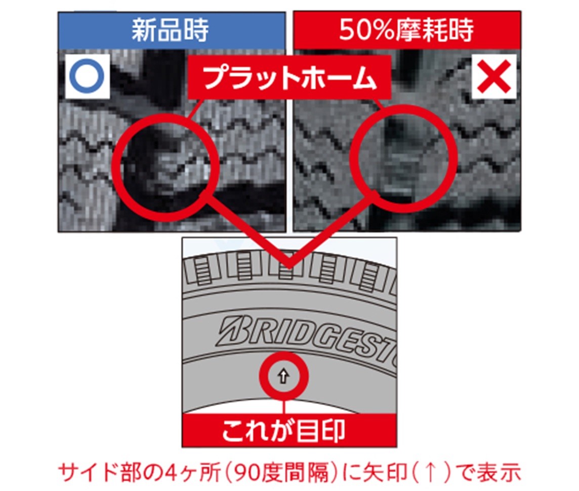 次はタイヤの摩耗具合です。夏タイヤは「スリップサイン」が現れる、溝の深さ1.6mmが使用限界となりますが、スタッドレスタイヤは溝の深さが新品の半分まで摩耗すると、冬用タイヤとして使えなくなります。溝の深さを点検する場所を「プラットホーム」と呼びますが、これはタイヤサイド4カ所 の矢印(↑)部分のトレッド(接地)面にあります。まだまだ溝は十分にあるなと思っていても、確認するとプラットホームが露出していたということがありますので、注意していただきたいところです。