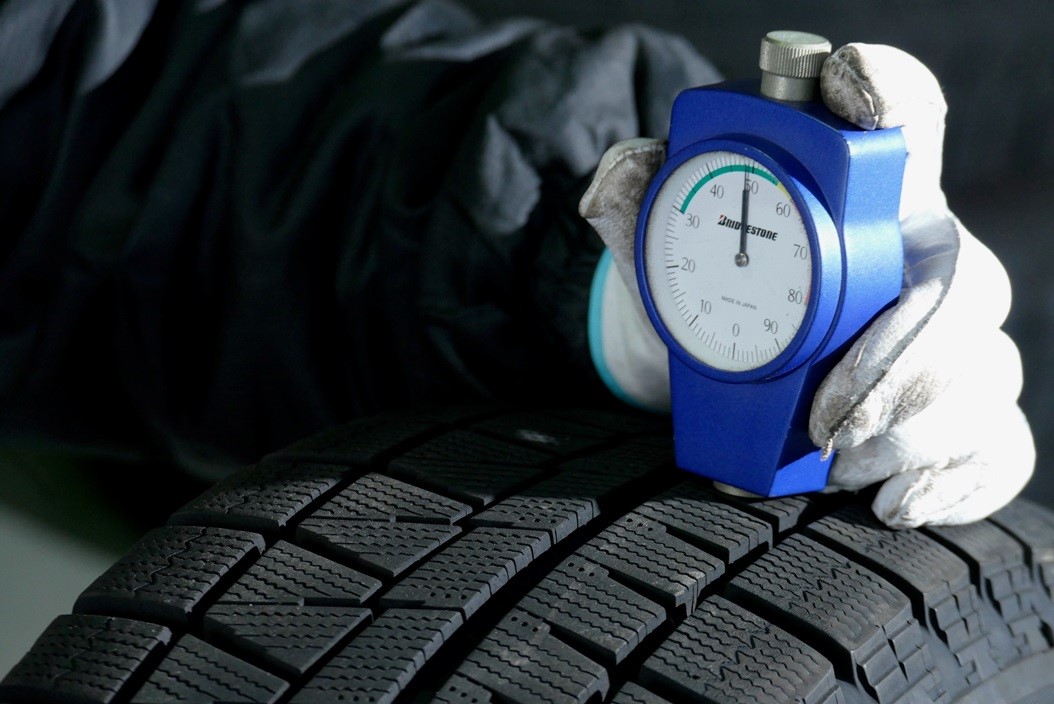 そしてもうひとつ、スタッドレスタイヤのコンディションで大事なのが硬度です。スタッドレスタイヤが氷雪路で滑りにくいのは、柔らかいゴムが路面に密着するから。それゆえゴムが硬くなったら、溝があっても十分な性能が引き出せなくなります。当店では専用の硬度計を使用してゴムの硬さをチェックします。見た目だけの印象では分かりにくい部分ですが、新品のスタッドレスタイヤとお使いいただいているタイヤの両方をチェックして比べると、その違いに驚かれる方も多いようです。残溝も含め、まだ使えるかどうか心配なときは、ぜひご相談ください。