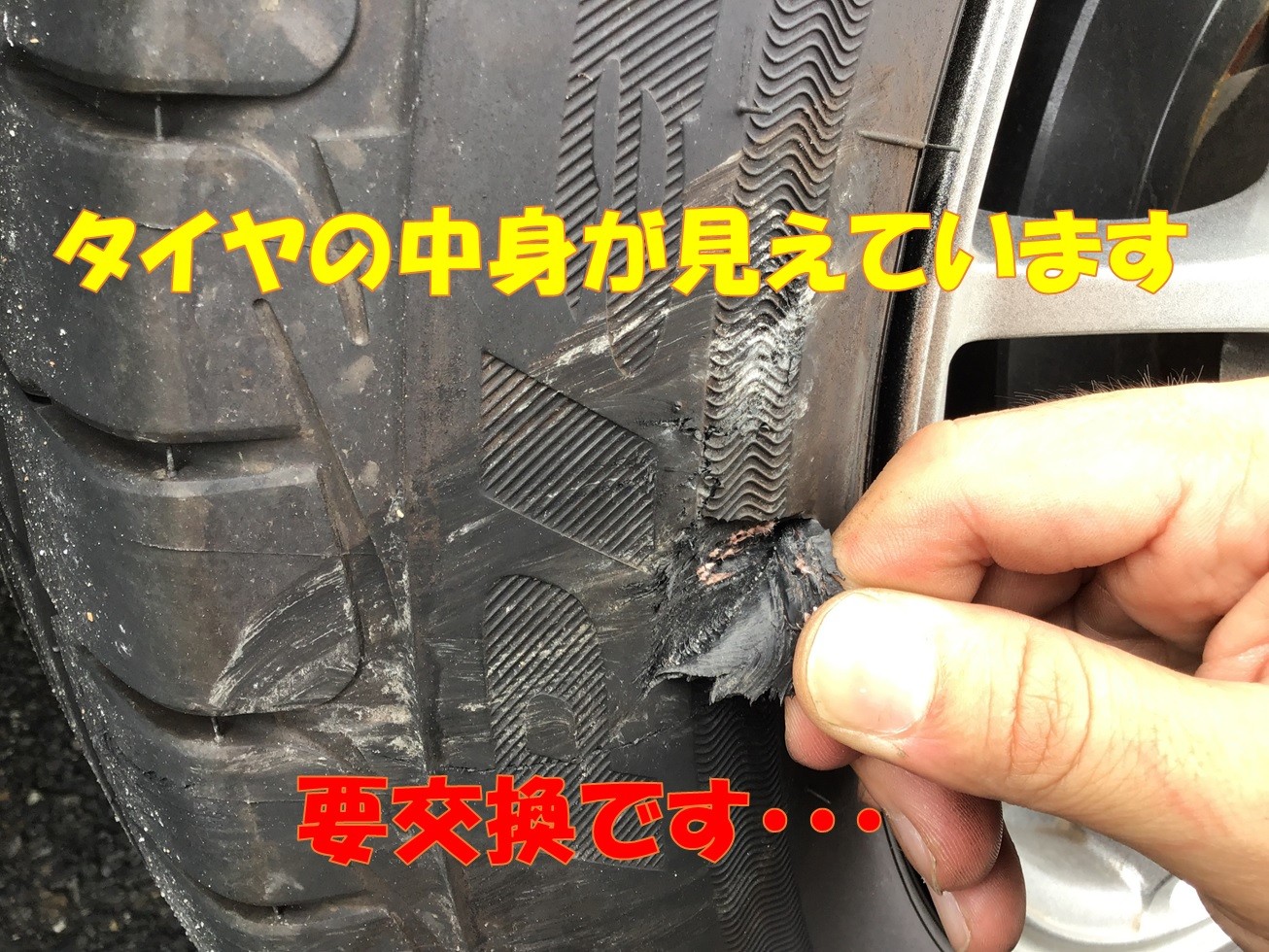 タイヤの素地が露出しています。何かの拍子にパンクする可能性があります。