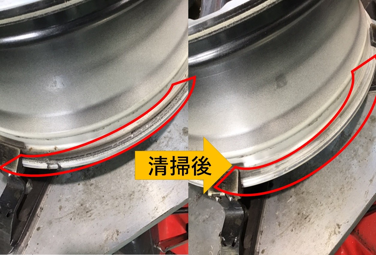 タイヤを剥がし、タイヤとホイールの密着していた部分をキレイにしていきます(掃除前後)