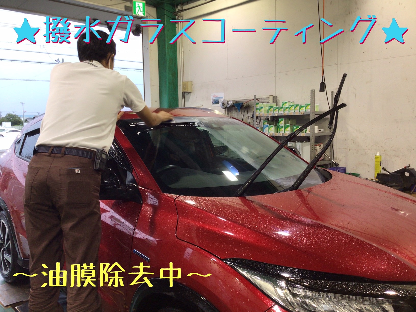 上のお写真のように、まずフロントガラスをきれいに洗浄し、