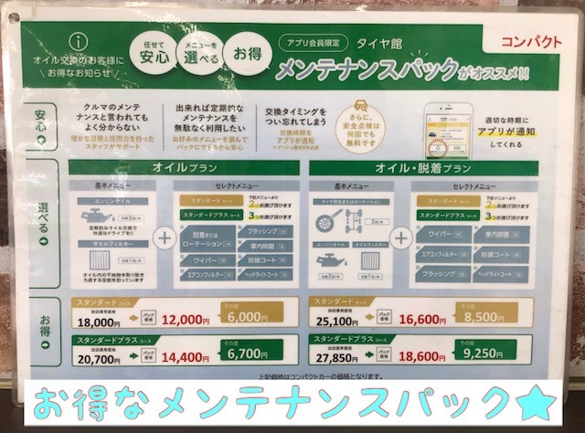 #タイヤ#タイヤ館#オイル交換#メンテナンスパック