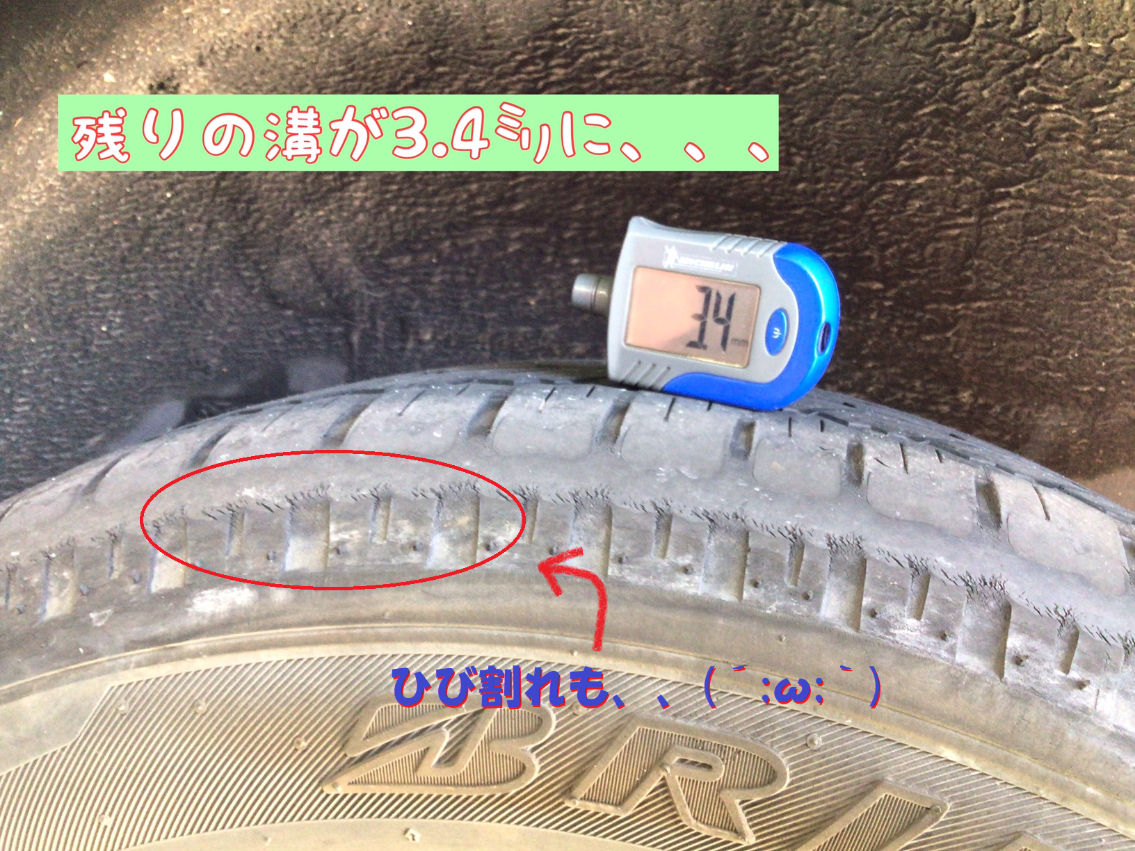 残りの溝が3.4㎜で、4年履かれていたタイヤです。
