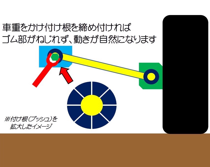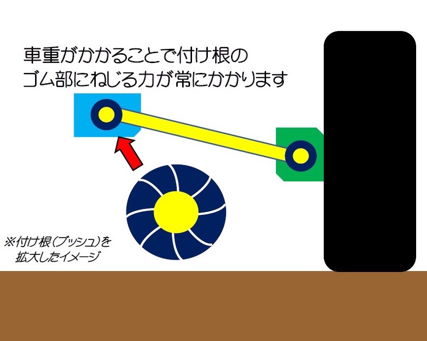 接地した時に足回りの付け根にねじれが発生します。付け根はゴムでできています。このラバーブッシュに生じたねじれが常に戻ろうとする力をかけています。もとに戻ろうとする力=ジャッキアップ・リフトアップした状態になろうとするのです。そうすると、足の動きがスムーズでなくなり足回り本来の性能をフルに発揮できません。また、せっかくの車高調なのに車高にばらつきが発生してしまいます。