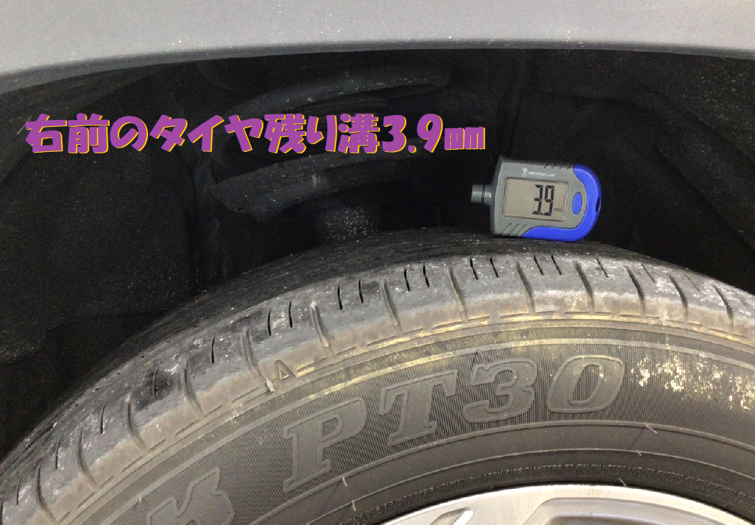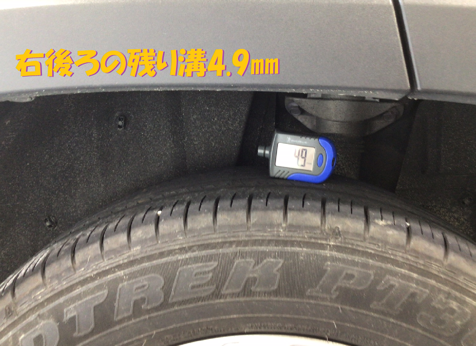 右前が3.9㎜で、右後ろが4.9㎜で1㎜もタイヤに溝差がありました。
