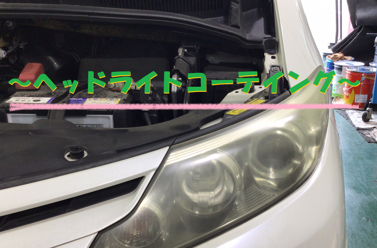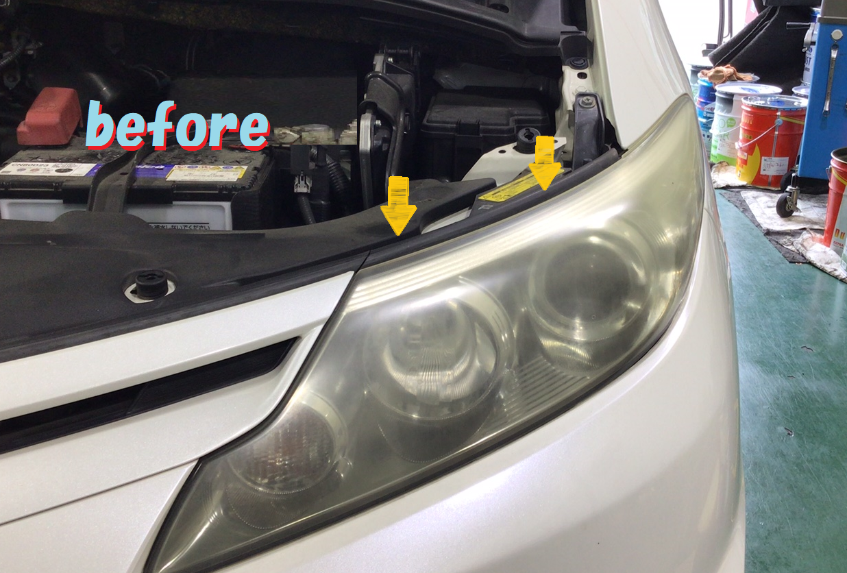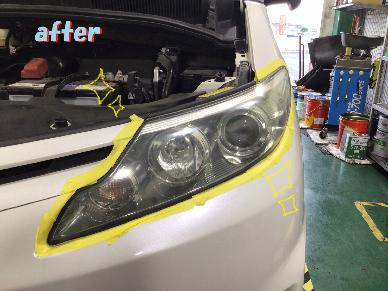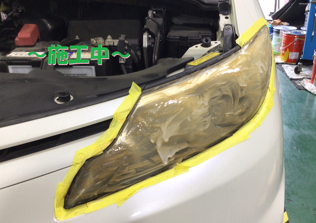 ↑施工中の途中ですが、ヘッドライトの洗浄剤を塗り、茶色くなっている部分が