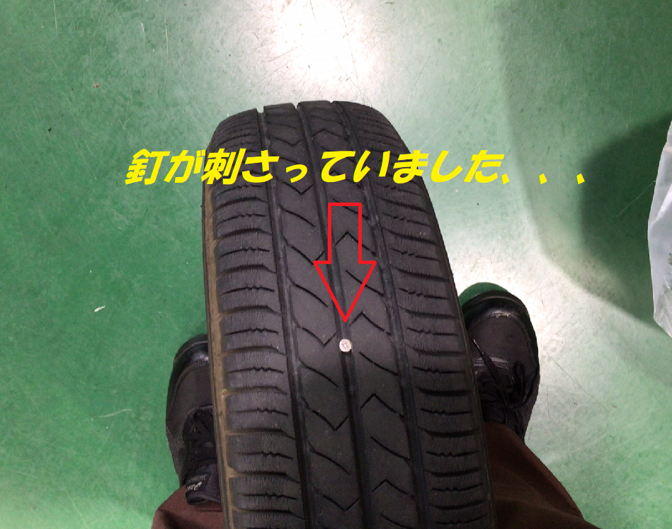 タイヤのど真ん中に釘が刺さっており、修理ができる場所でしたが