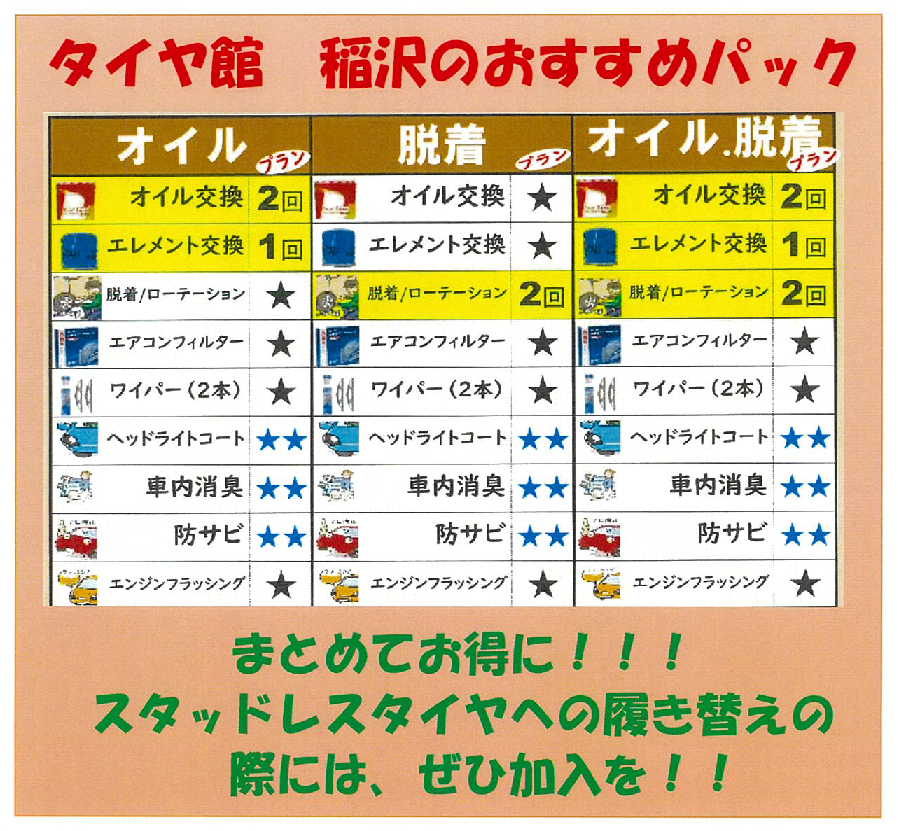 タイヤ館 稲沢では、お得に脱着ができるメンテナンスパック