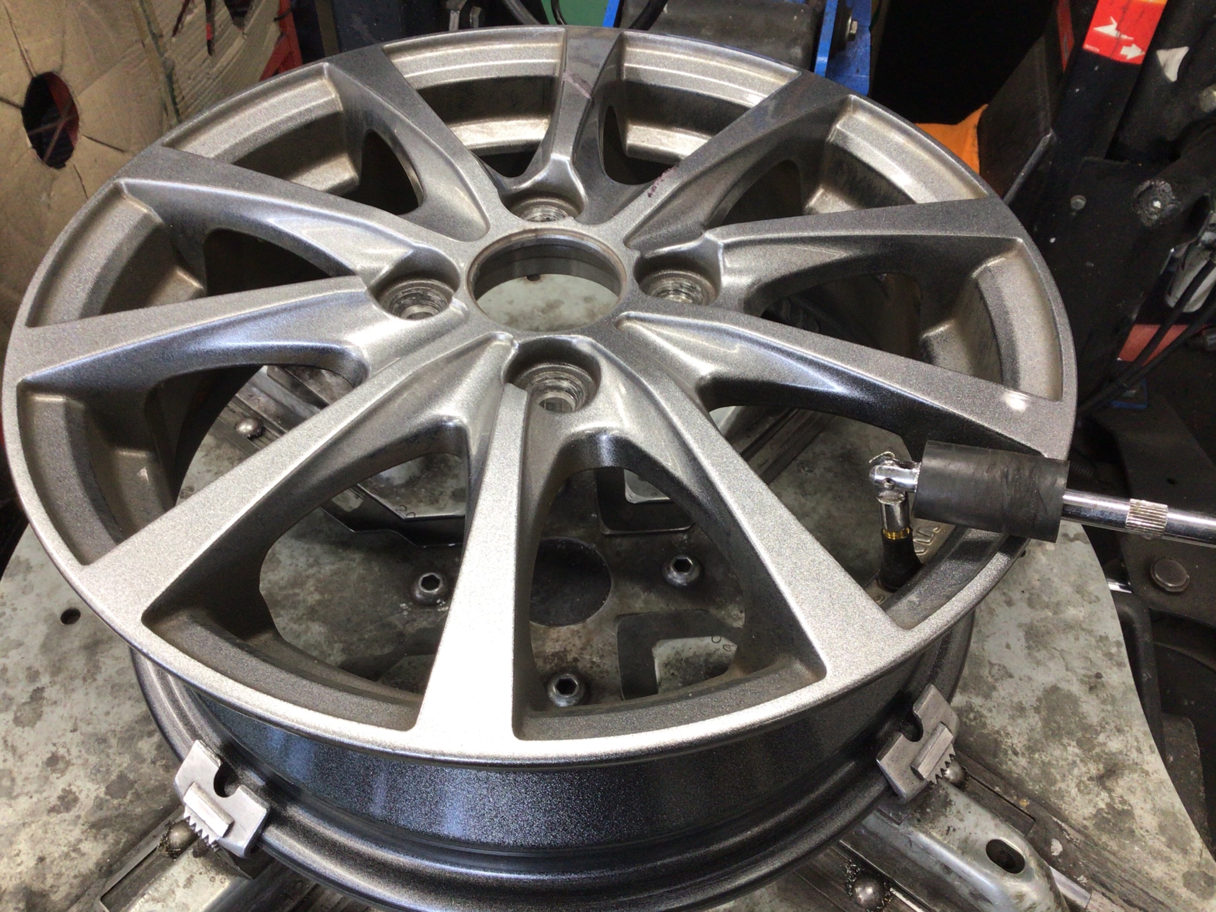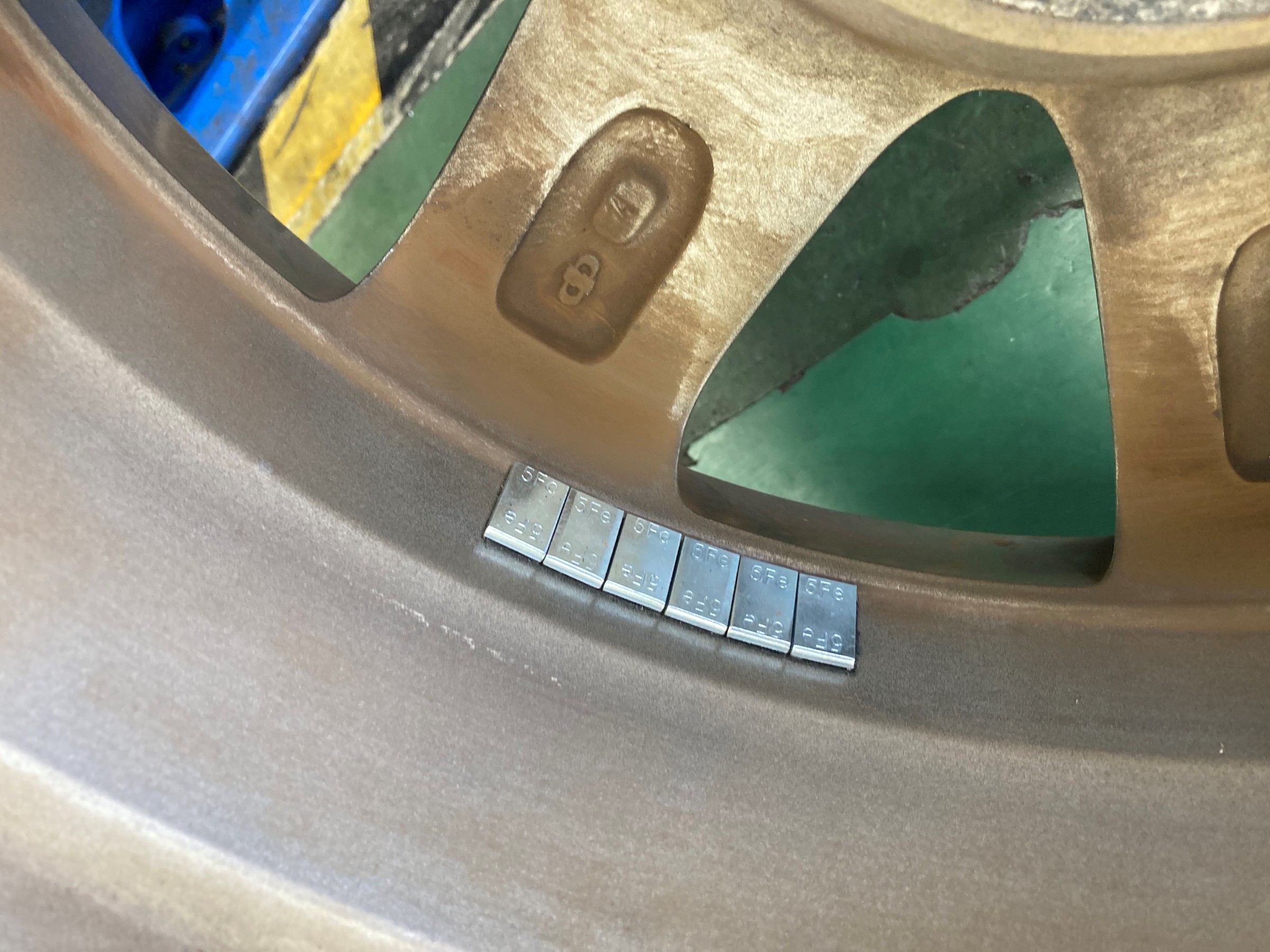 ↓ バランス調整。走行中のハンドルのブレや振動を抑える効果があります。回転させてズレを測定しズレが生じていればウェイト(鉄製の錘)で補正します。