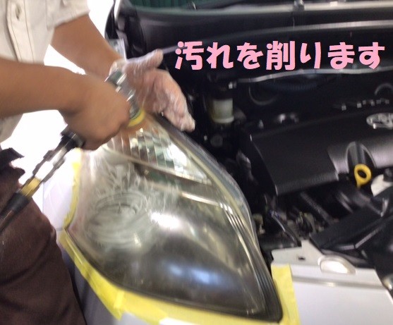 汚れを機械で削り、ヘッドライト洗浄剤を塗り、
