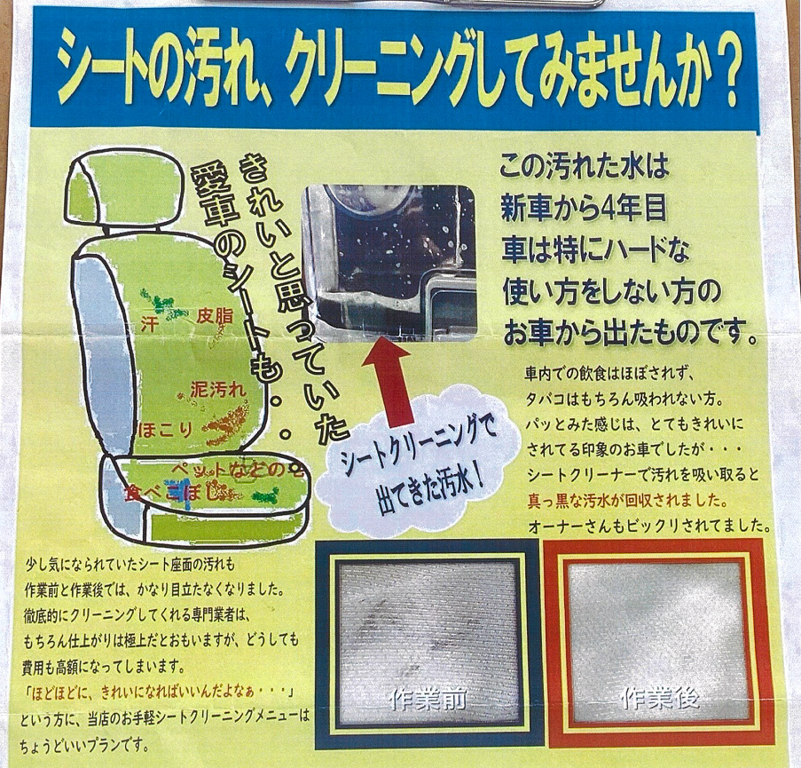 シートクリーニングでお車のシートのキレイに洗浄!!