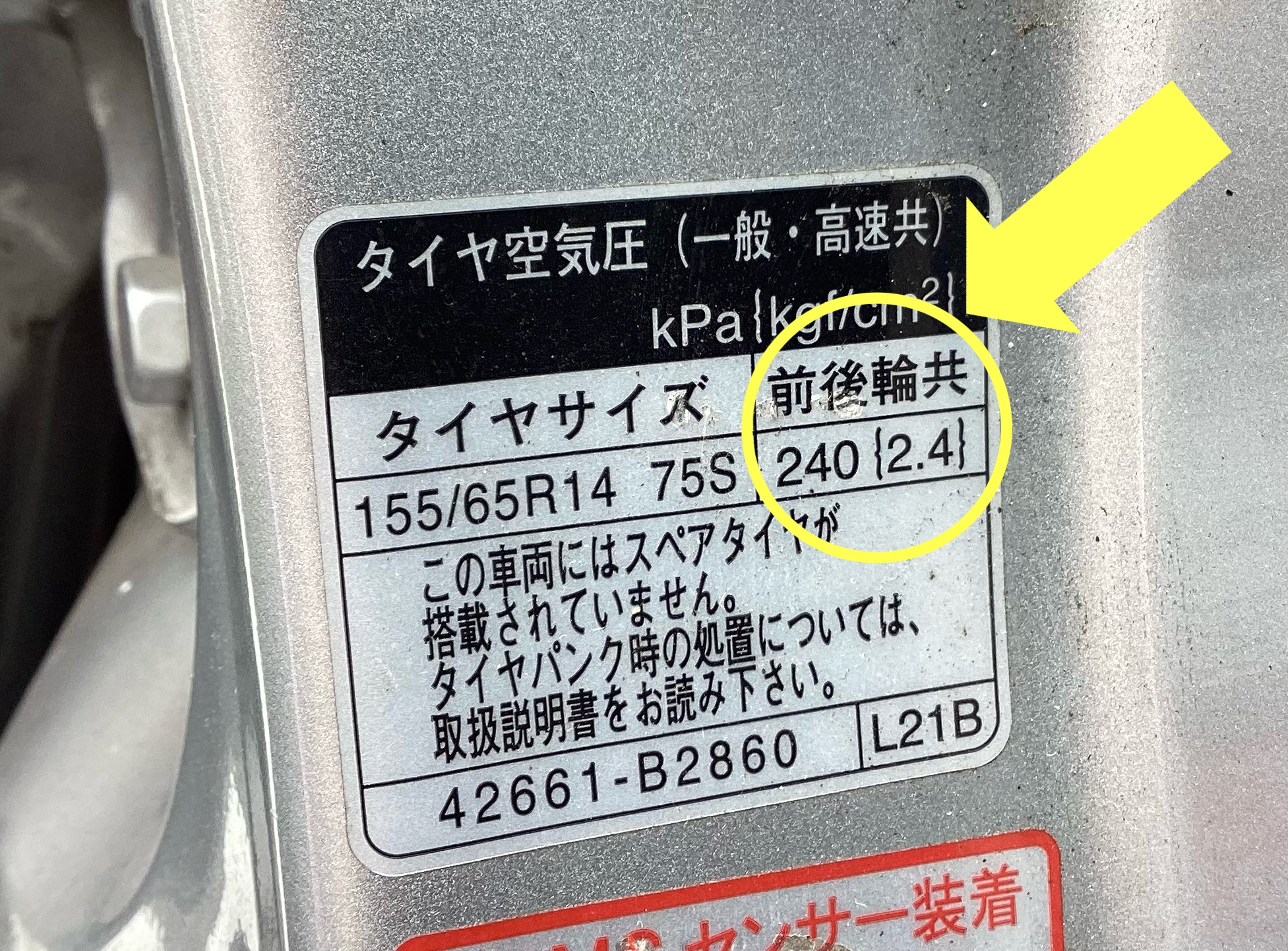 多くの車が運転席のドアを開けると指定空気圧の表示があります。