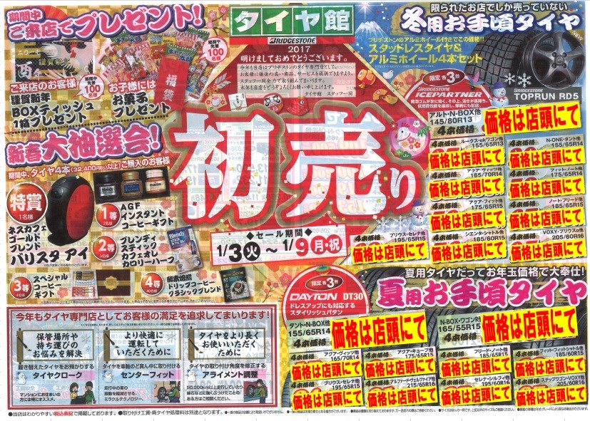 あけましておめでとうございます ポスト 2017年1月1日 愛知県 稲沢市津島市あま市一宮市 岐阜県海津市その他近隣のお客様 こんにちは。愛知県稲沢市福島町のタイヤ館稲沢です。 今年も当店はブリヂストンのタイヤ専門店として、 お客様に価値の高い商品、サービスを提供できますよう、 スタッフ一同全力で取り組んでまいります。 本年も当店をどうぞよろしくお願い申し上げます。 なお、1月3日より 初売りセールを開催させて頂きます。 どうぞご来店ください。 タイヤ館稲沢 店長 坪内貴之 カテゴリ:お知らせ