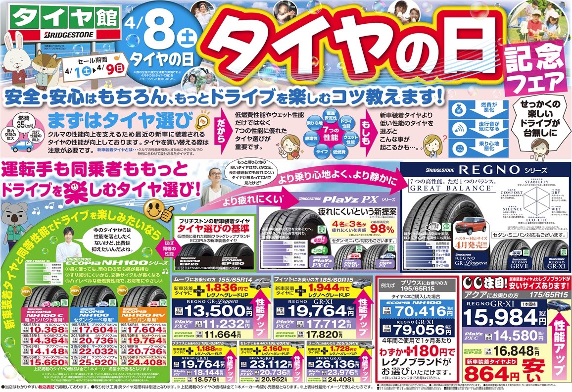 タイヤの日記念フェア、本日までですよ~ ポスト 2017年4月9日 愛知県 稲沢市津島市あま市一宮市 岐阜県海津市 その他近隣のお客様、こんにちは。 愛知県稲沢市福島町のタイヤ館稲沢です。 タイヤ館稲沢では、『タイヤの日記念フェア』開催中ですよ~。 この春新登場の「NH100シリーズ」「アレンザ001」はもちろん、 登場に伴い廃盤となった商品のアウトレットセールも見逃せない!! そろそろスタッドレス外さなきゃ~ってお客様、 この機会にどうですか? ぜひタイヤ館稲沢へ!! カテゴリ:お知らせ