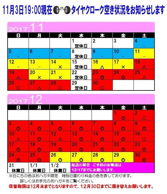 ■■■タイヤ保管のお取り寄せ最短は11/16です■■■ ポスト 2017年11月3日 愛知県 稲沢市津島市あま市一宮市 岐阜県海津市 その他近隣のお客様 こんにちは。 愛知県稲沢市福島町のタイヤ館稲沢です。 当店のタイヤクローク(保管)をご利用のお客様への お知らせです。 DMを送らさせていただいてから履き替えのご連絡を多数頂いております。 そのため 只今お取り寄せに10日近く頂いております。 11/3 19:00現在 最短のお取り付けは 『11月16日』となっております。 早めのお電話をお願いします。 カテゴリ:お知らせ