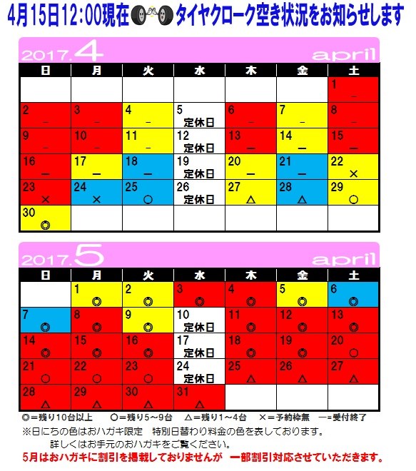 ■■■タイヤ保管のお取り寄せ最短は4/25です■■■ ポスト 2017年4月15日 愛知県 稲沢市津島市あま市一宮市 岐阜県海津市 その他近隣のお客様 こんにちは。 愛知県稲沢市福島町のタイヤ館稲沢です。 当店のタイヤクローク(保管)をご利用のお客様への お知らせです。 現在 履き替えのお客様のピークをむかえており 只今お取り寄せに10日近く頂いております。 4/15 12:00現在 最短のお取り付けは 『4月25日』となっております。 早めにご連絡ください。 お電話お待ちしております カテゴリ:お知らせ