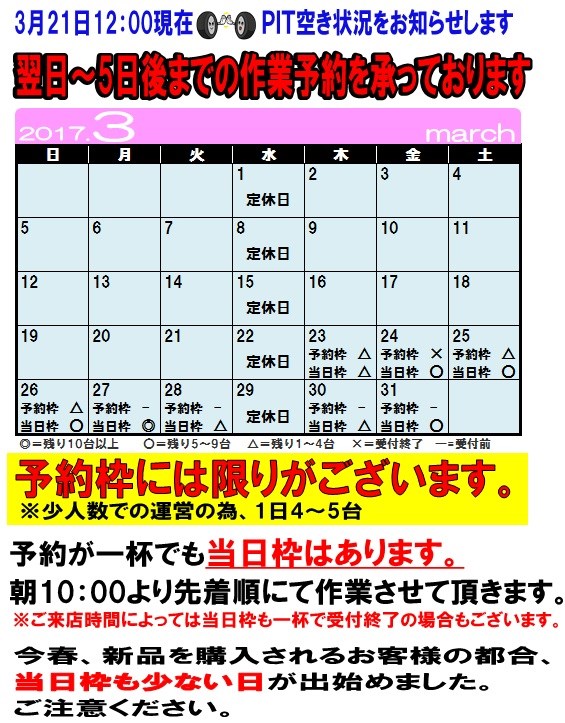 ◆◆3/21 12:00現在の脱着(持ち込みの履き替え)専用PIT空き状況◆◆ ポスト 2017年3月21日 愛知県 稲沢市津島市あま市一宮市愛西市清須市蟹江町 岐阜県海津市 その他近隣のお客様 こんにちは。 愛知県稲沢市福島町のタイヤ館稲沢です。 カテゴリ:お知らせ