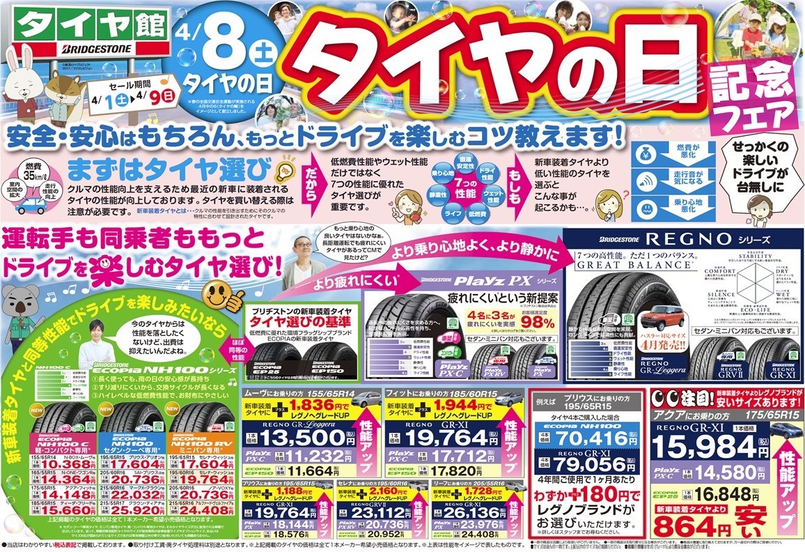 ちなみに 只今タイヤ館では、タイヤの日記念フェアを4/8まで開催中です。
