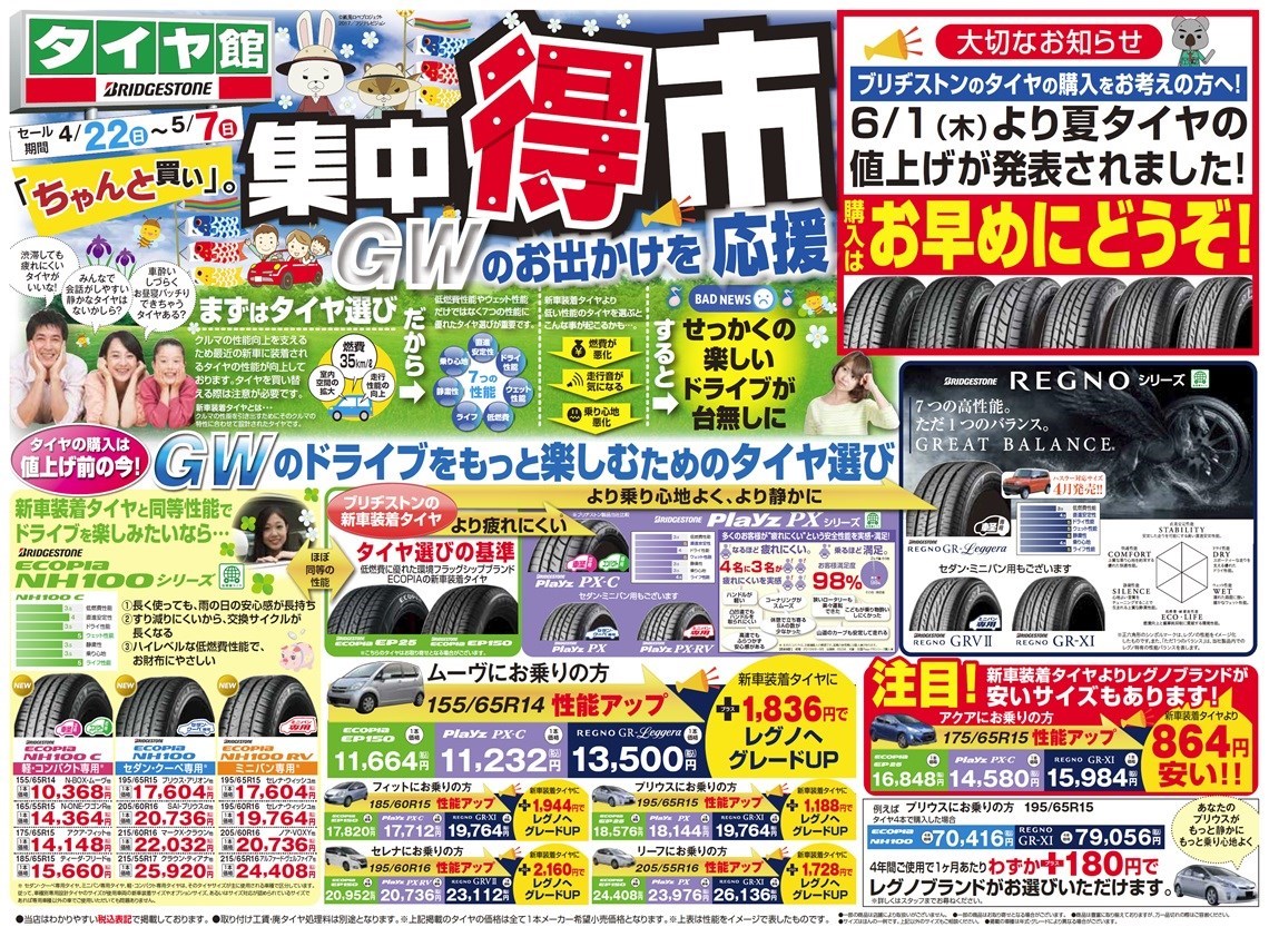 ただいま タイヤ館稲沢では、GW安心・安全「ちゃんと買い」。集中得市を開催中です。