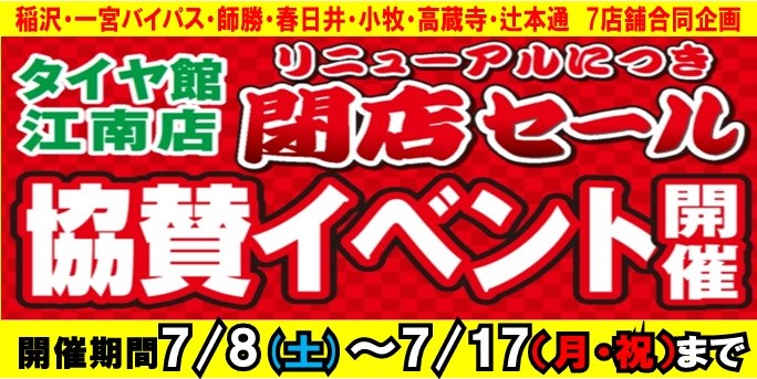 タイヤ館江南店リニューアルにつき閉店セール協賛イベント開催中です♪