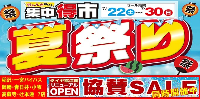 【あと5日】集中得市「夏祭り」&江南店リニューアルオープン協賛セール ポスト 2017年7月17日 愛知県 稲沢市津島市あま市一宮市 岐阜県海津市 その他近隣のお客様 こんにちは。 愛知県稲沢市福島町のタイヤ館稲沢です。 本日まで、江南店リニューアルに伴う閉店セール協賛イベント開催集のタイヤ館ですが またまたセール開催決定しました。 集中得市「夏祭り」&江南店リニューアルオープン協賛セールまであと5日です もうすぐ夏休みですね。 この機会に愛車のメンテナンスどうですか? こちらのメンバーが皆様をお待ちしております。 ぜひこの機会にご来店ください カテゴリ:お知らせ
