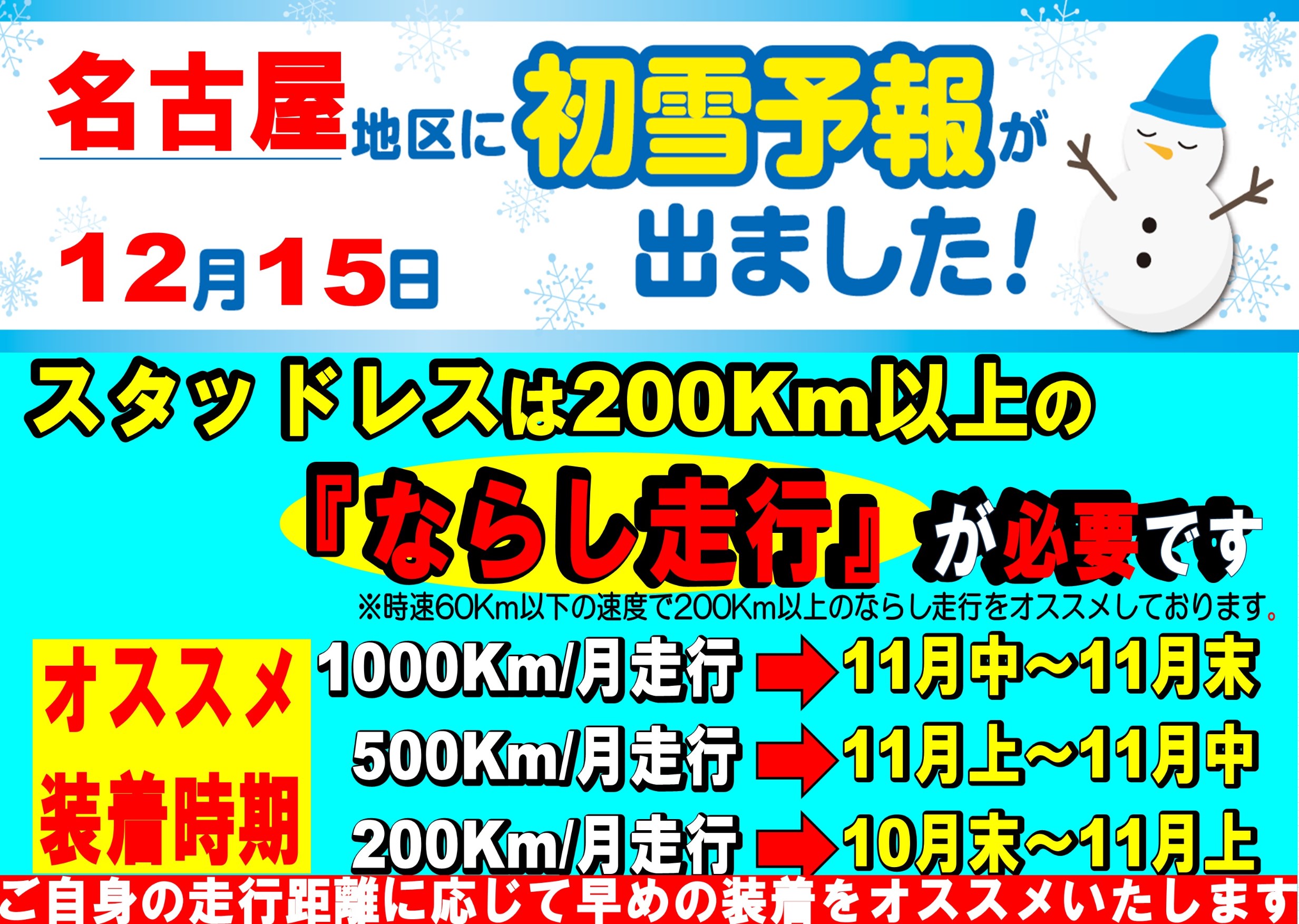 スタッドレスはならしが必要!! 距離を普段乗らない方は 10月にも装着したほうが