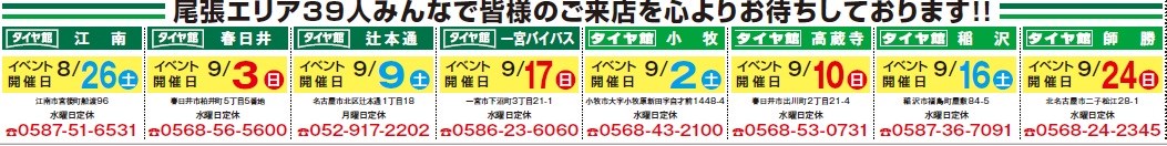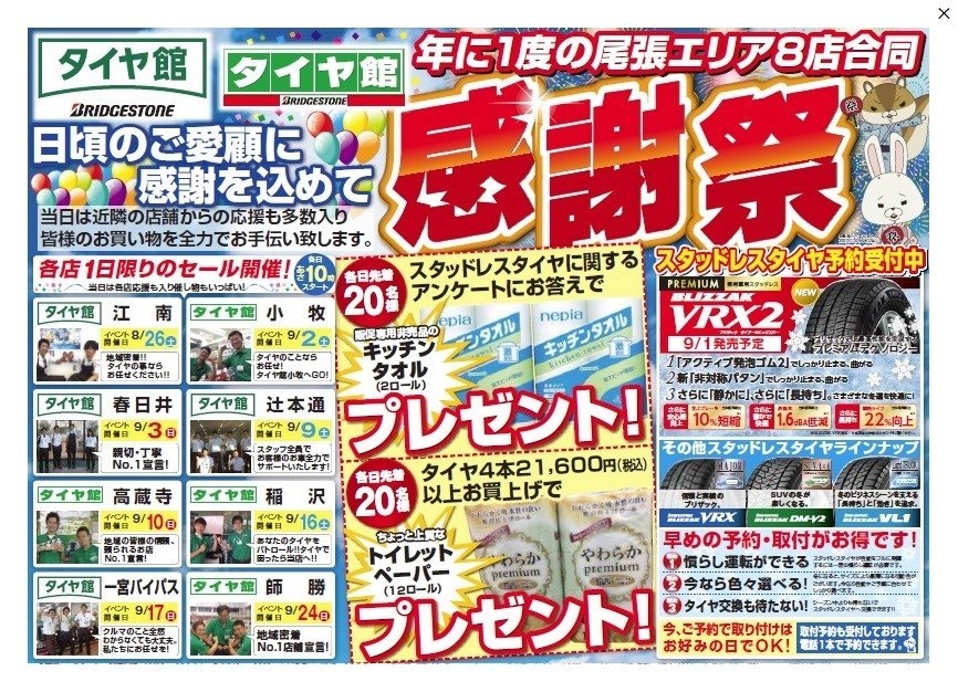 【あと2日】 タイヤ館稲沢 感謝祭!! 9/16 1DAY