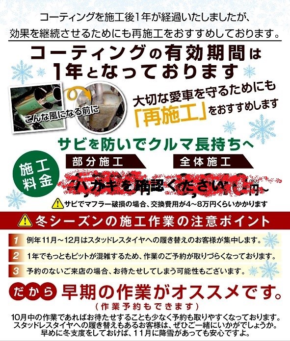 10月31日までがキャンペーン期間となりますので、ハガキの届いたお客様はスタッドレスタイヤの履き替えと一緒に再施工しませんか?