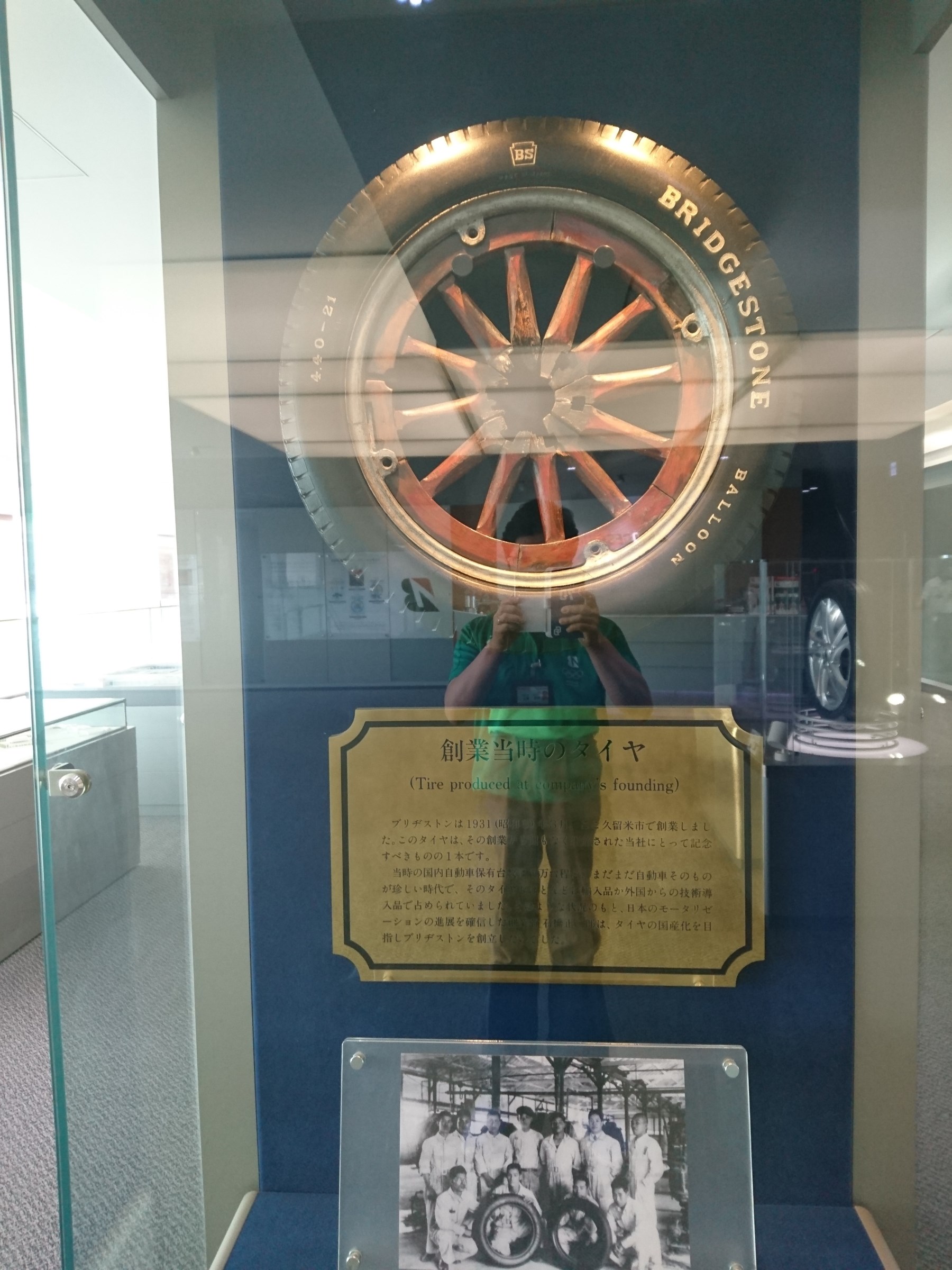 写真は 創業当時のタイヤです。 ブリヂストンのマザープラント「久留米工場」に展示されています。