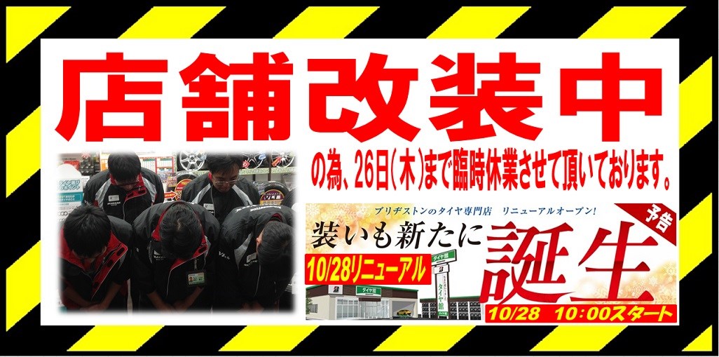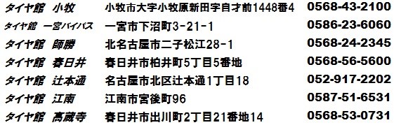 ただいま、10月28日のリニューアルオープンに向け改装中です。 ポスト 2017年10月22日 愛知県 稲沢市 津島市 あま市 愛西市 一宮市 蟹江町 大治町 清須市 岐阜県海津市 三重県桑名市 その他、近隣のお客様 こんにちは。 愛知県稲沢市福島町のタイヤ館稲沢です。 ただいま、10/28リニューアルオープンに向けて 店舗改装中の為臨時休業をさせていただいております。 ご迷惑おかけして申し訳ありませせんがよろしくお願いします。 お急ぎのお客様は下記の尾張エリア7店舗をご利用ください。 稲沢店での顧客データを確認し、いつものサービスをご提供させていただきます。 カテゴリ:お知らせ