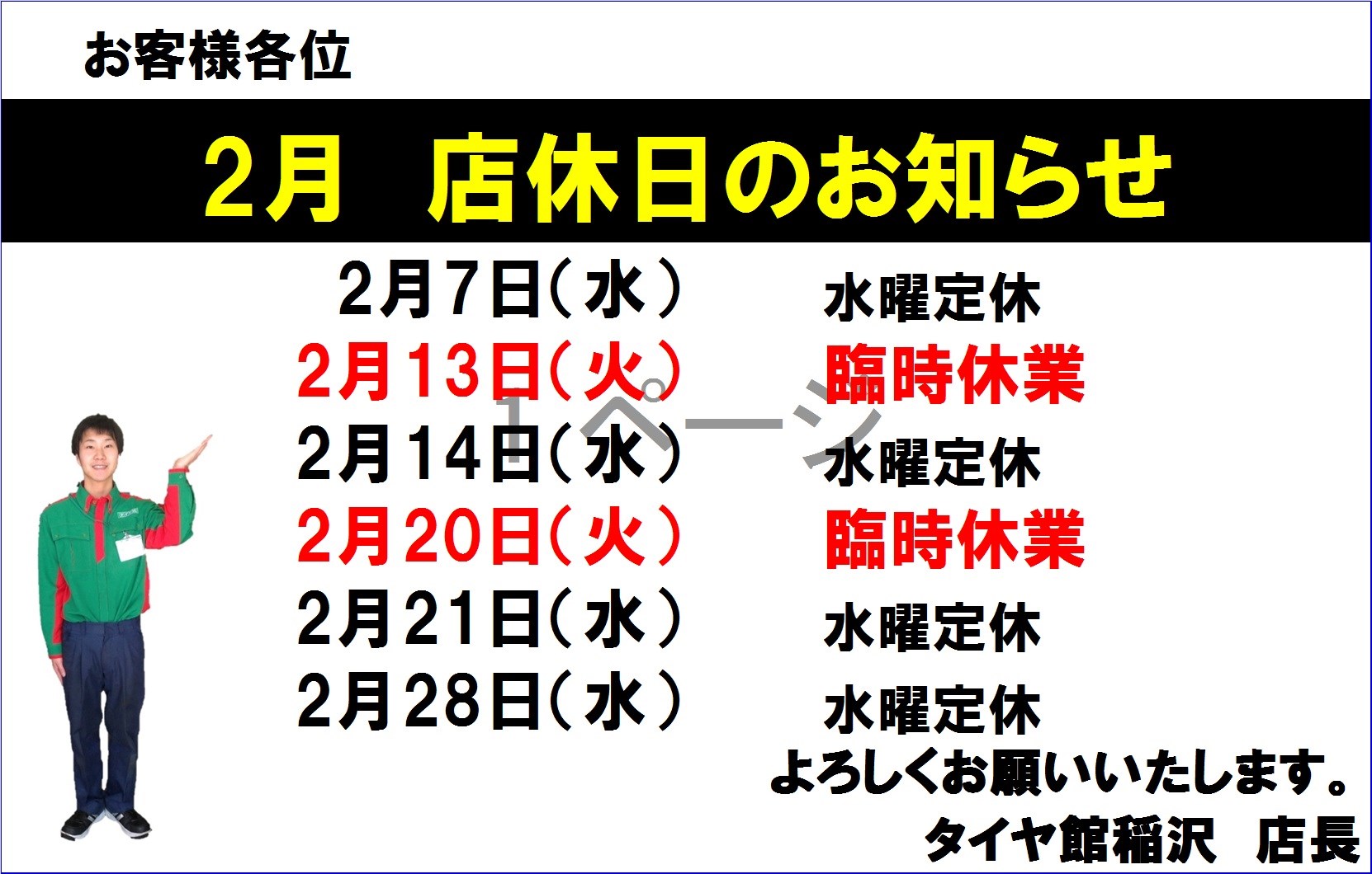 2月 店舗休業日のお知らせです。