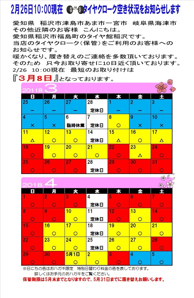 2月26日 10:00現在のタイヤ保管脱着PIT空き状況をお知らせします。
