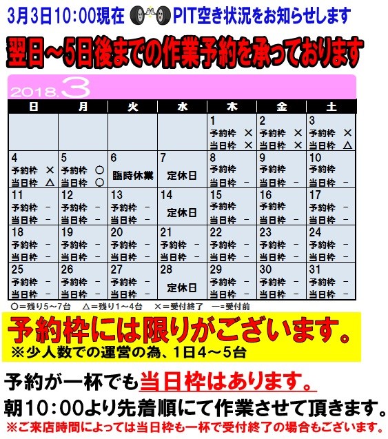 3月3日 10:00現在のお持込でのタイヤ脱着 混雑状況をお知らせします。