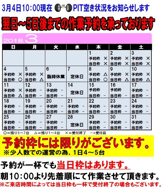 3月4日 10:00現在のお持込でのタイヤ脱着 混雑状況をお知らせします。 ポスト 2018年3月4日 3/410:00現在 翌日~5日以内(営業日)ですと3月11日まで受付日となりますが 8日(僅少)以外はおかげさまで予約が一杯の状態です。 予約が一杯の日でも、当日枠はご用意しております。 特に10:00~11:00までの作業に関しては、毎日空いております。 開店から先着順にて作業させていただきます。 よろしくお願いします。 カテゴリ:お知らせ