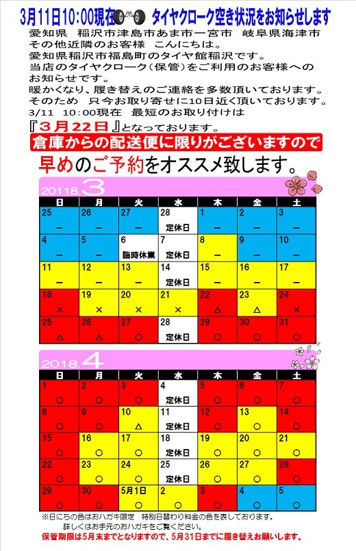 3月11日 10:00現在のタイヤ保管脱着PIT空き状況をお知らせします。