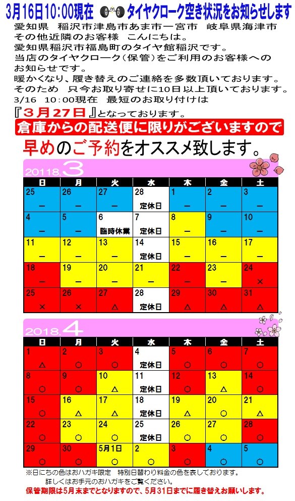 3月16日 10:00現在のタイヤ保管脱着PIT空き状況をお知らせします。