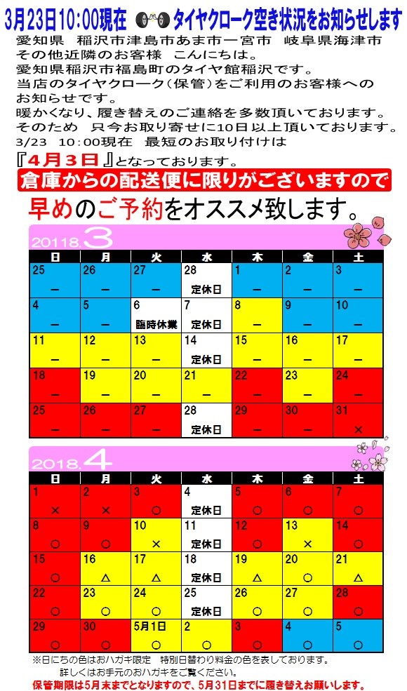 3月23日 10:00現在のタイヤ保管脱着PIT空き状況をお知らせします。