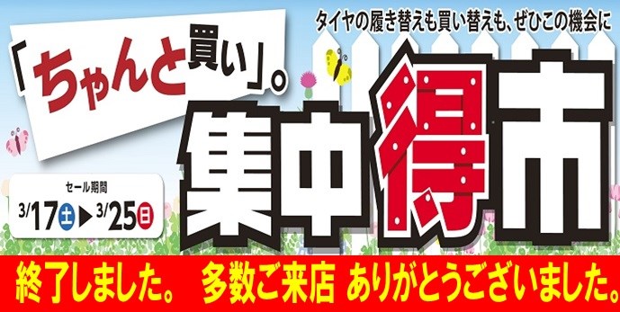 集中得市、終了しました ポスト 2018年3月25日 愛知県稲沢市、津島市、あま市、一宮市、岐阜県海津市、その他、近隣のお客様、こんにちは。 愛知県稲沢市福島町のタイヤ館 稲沢です。 集中得市、終了しました。 たくさんのご来店、ありがとうございました。 カテゴリ:お知らせ