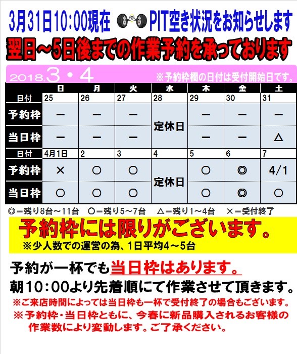 3月31日 10:00現在のお持込でのタイヤ脱着 混雑状況をお知らせします。