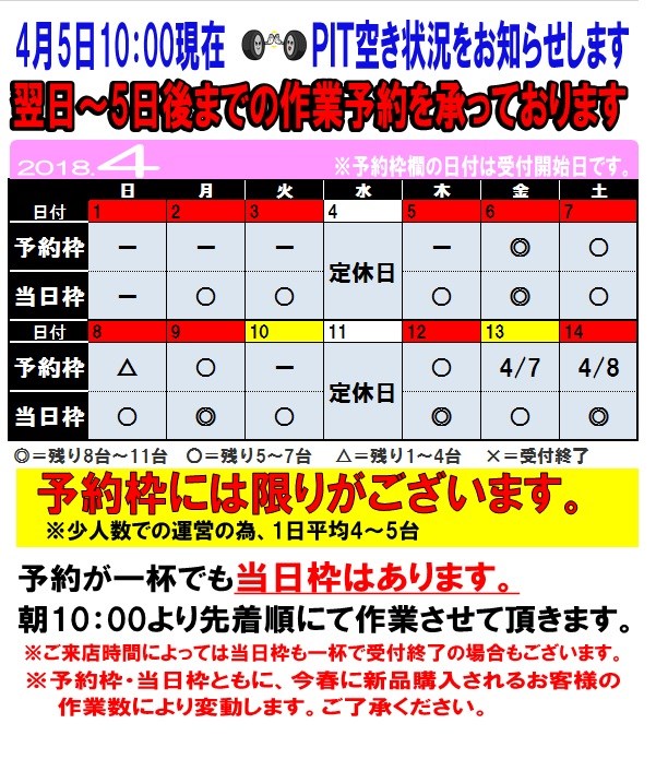 4月5日 10:00現在のお持込でのタイヤ脱着 混雑状況をお知らせします。