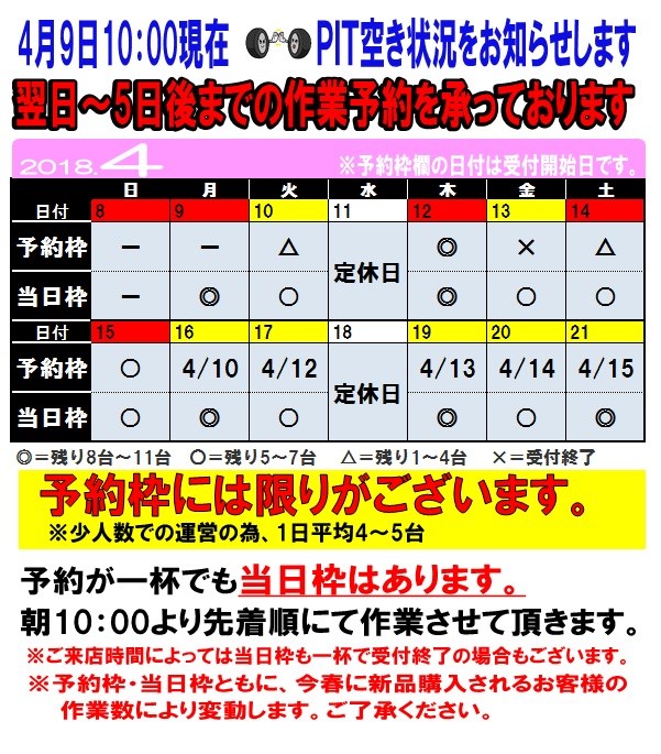 4月9日 10:00現在のお持込でのタイヤ脱着 混雑状況をお知らせします。