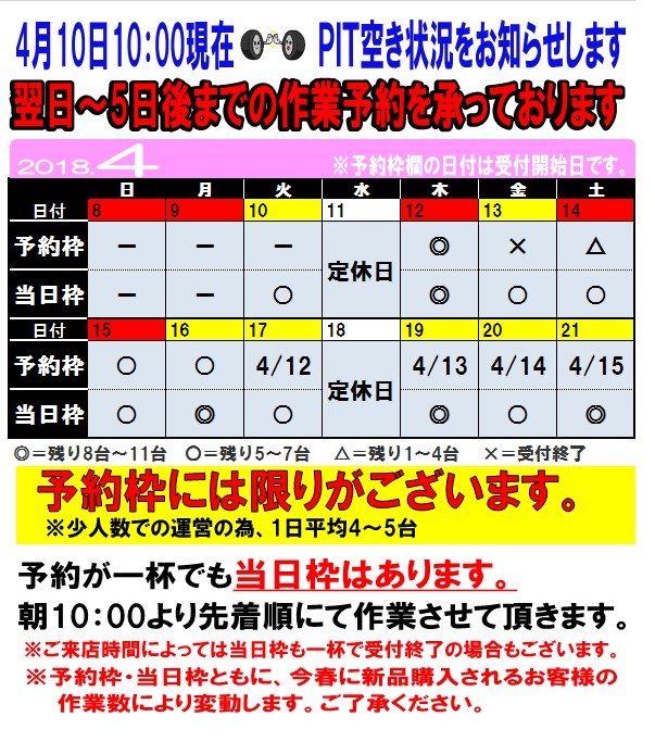 4月10日 10:00現在のお持込でのタイヤ脱着 混雑状況をお知らせします。