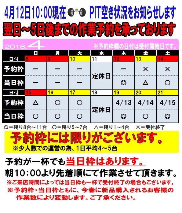 4月12日 10:00現在のお持込でのタイヤ脱着 混雑状況をお知らせします。