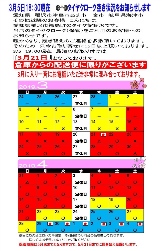 3月5日 18:30現在のタイヤ保管脱着PIT空き状況をお知らせします。