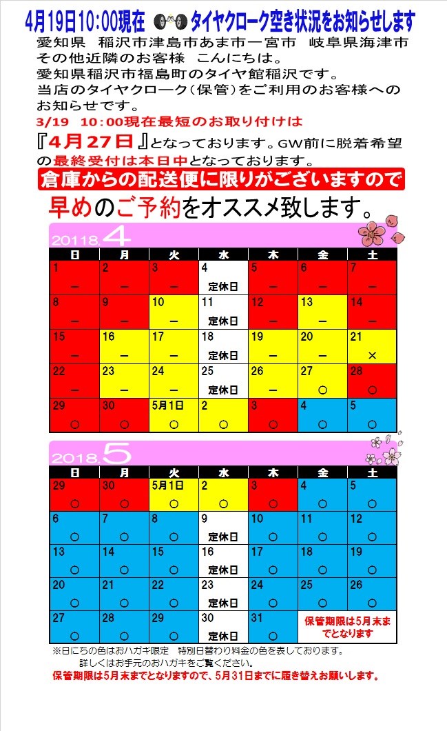 4月19日 10:00現在のタイヤ保管脱着PIT空き状況をお知らせします。