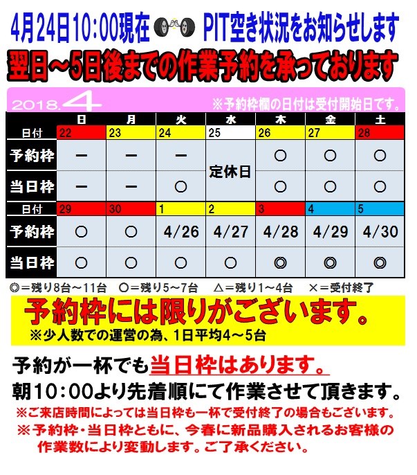 4月24日 10:00現在のお持込でのタイヤ脱着 混雑状況をお知らせします。
