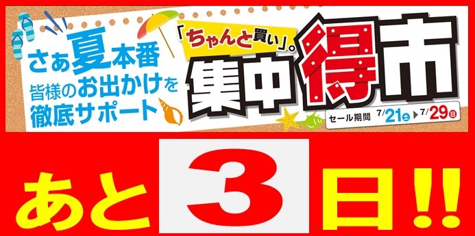 さぁ夏本番「ちゃんと買い 集中得市」まであと3日デス!! ポスト 2018年7月18日 愛知県 稲沢市津島市あま市一宮市 岐阜県海津市 その他近隣のお客様、こんにちは。 愛知県稲沢市福島町のタイヤ館 稲沢です。 さぁ夏本番「ちゃんと買い 集中得市」まであと3日デス!! 夏の集中得市を7月21日(土)~7月29日(日)の9日間、開催します。 夏休み・お盆に家族でお出掛け でも愛車は大丈夫? タイヤ館で一度メンテナンスはいかがですか? この時期、タイヤのトラブル急増します。 カテゴリ:お知らせ